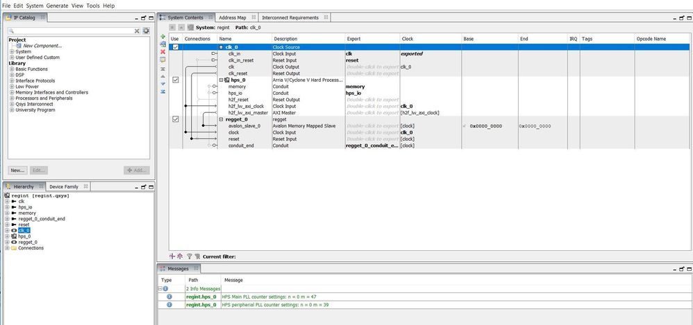 Hi, I have made the following qsys system as shown in fig. I have assigned the outputs to the LEDS. So whatever number I sent via putty terminal, the corresponding LEDS are light up on the board. The header file I generate with generate script gives me the base address and offset address of the LEDS. Now, I don't want to use any hardware peripheral on board, I just want that whatever value I send to the register, the value saved in the register is simply shown at the putty terminal. I am just confused that I have used LEDs in my pin assignment editor of my Quartus software so that's why a header file is generated that tells me the base and offset addresses but how do I get base and offset address of my output terminal with out because these are the addresses that I am using to tell my c code that give me output at this address and write at this address.