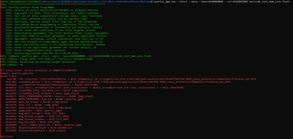 we create the design with nios,ocm,jtag,serial flash controller ip(legacy epcs/epcq controller) and generated the flash files. we tried to flash the device using nioss ii command shell.
