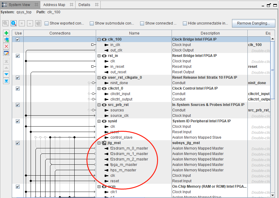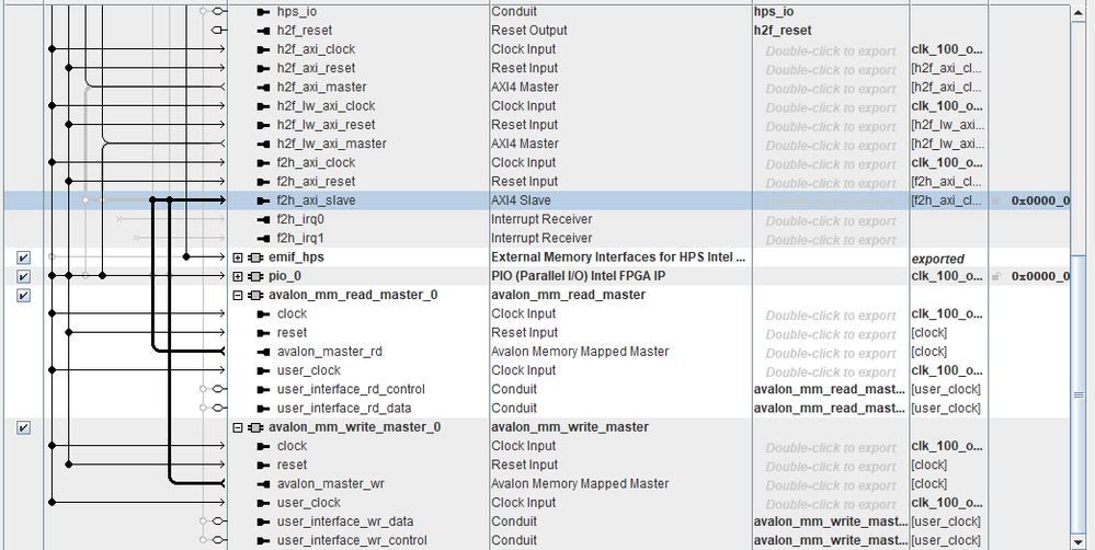 I code avalon_mm_read_master module and avalon_mm_write_master module by myself, and I put them into Platform Designer as Figure 1 shown.