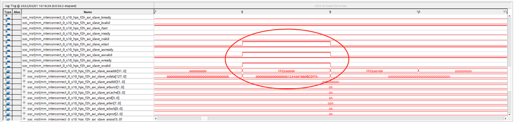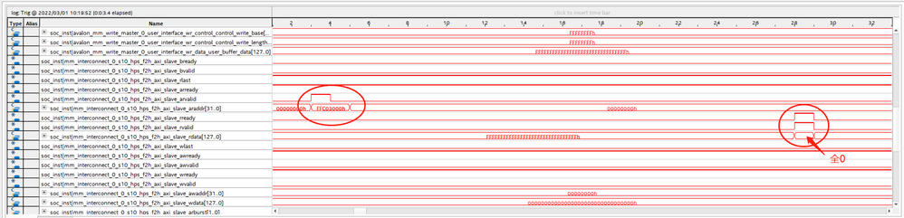 Then I change read and write address to l4 slave peripheral address such as uart(0xffc02000) and gpio(0xffc03000). Data grabed in SignalTap shows in Figure 2 and Figure 3. From figures, the operation that data is written into the exact setting address succeeds, but data read out of the address is all zero, which means data cannot be read/wrote into l4 slave peripheral bus address.