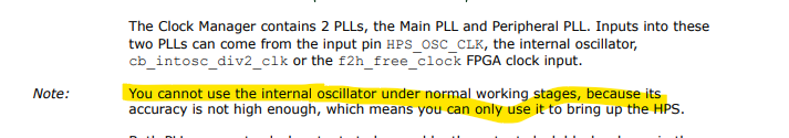 The confusion is actually because of the documentation statement that mentioned about the inputs to PLL but on the note below, it does mentioned that Internal OSC cannot be used under normal circumstances. Internal OSC is meant for bring up HPS, after bring up HPS will switch to HPS_OSC_CLK