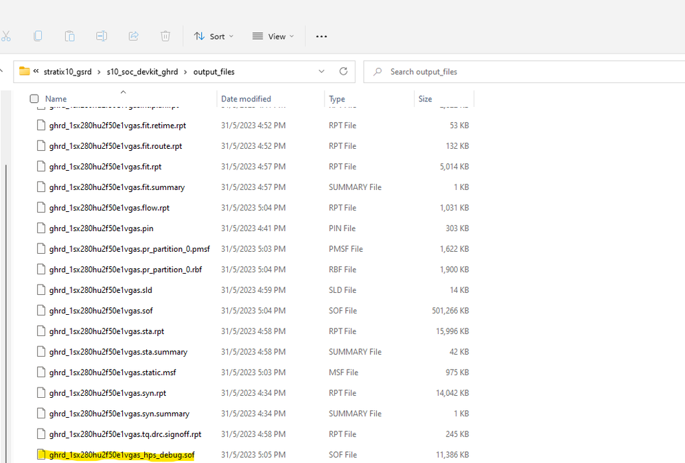 - ghrd_1sx280hu2f50e1vgas_hps_debug.sof - FPGA SOF, with HPS Debug FSBL