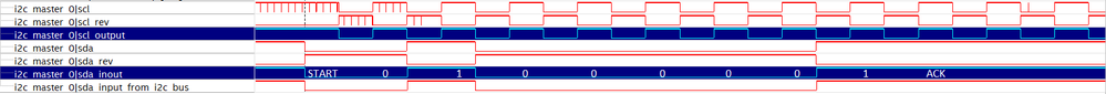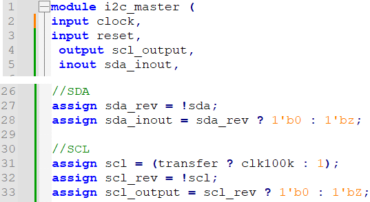Since I2C signals are connected externally to pull-up resistors I have two signals (sda and scl) with the value I want the I2C bus to have. And then I have two wires with the inverted/reverse value (sda_rev and scl_rev). These signals are the output enables of tri-state buffers: