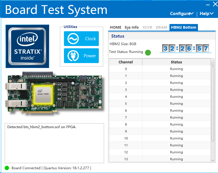 We find that the HBM on Intel Stratix 10 MX FPGA fails to calibrate successfully. After providing clock and releasing reset, the port local_cal_success is low and local_cal_fail is high. We also use the board test system to test it, but the Test Status is always running as shown below. Is this result correct?