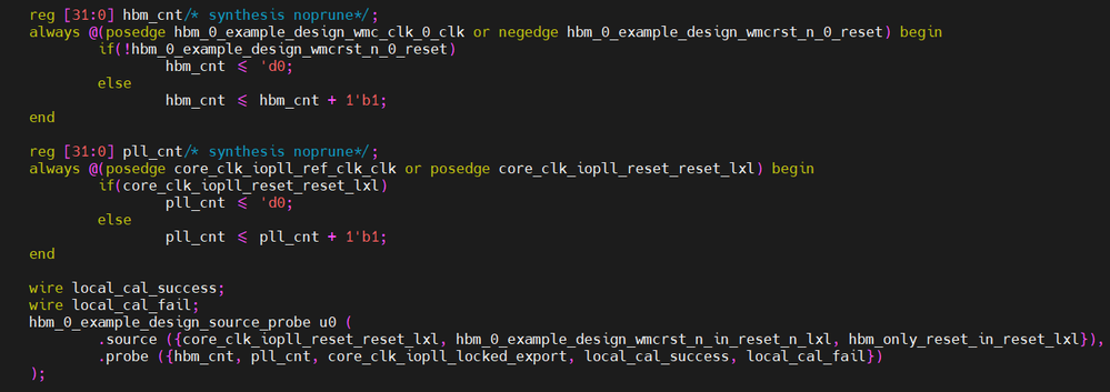 In addition, I add a In-System Sources and Probes Editor to source three reset signals, core_clk_iopll_reset_reset_lxl, hbm_0_example_design_wmcrst_n_in_reset_n_lxl and hbm_only_reset_in_reset_lxl, which are connected to core_clk_iopll_reset_reset, hbm_0_example_design_wmcrst_n_in_reset_n, hbm_only_reset_in_reset ports of HBM2 ip respectitively. And it can probe the above counters, lock signal of PLL and calib status signals.