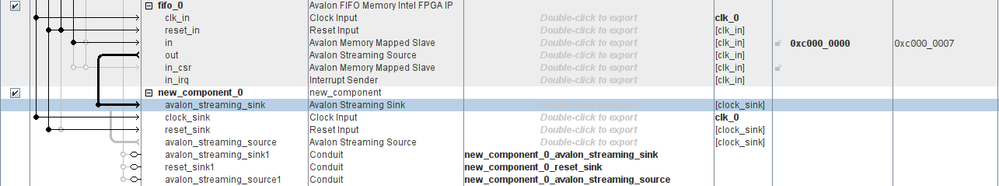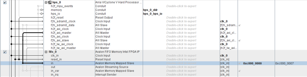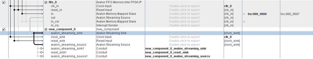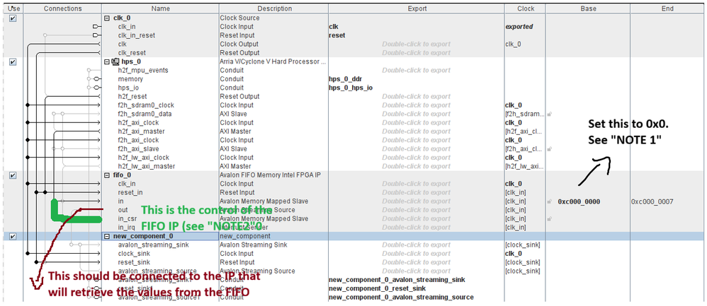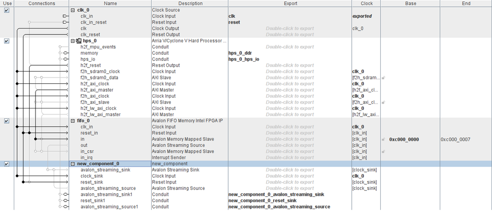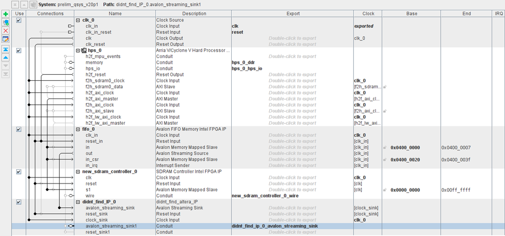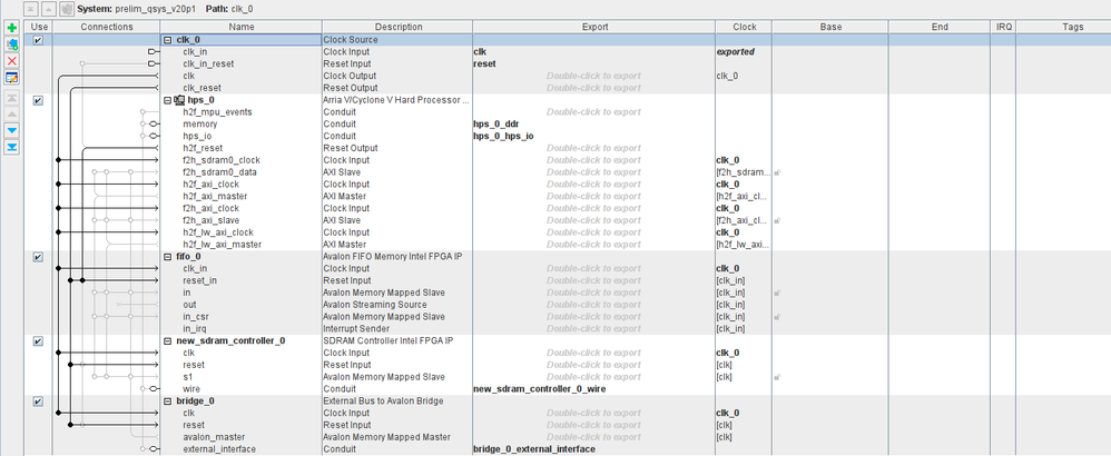 I’m pretty sure my problem is in the Platform Designer (formerly Qsys) layout. Been trying many variations around this layout for several weeks, but with no success: