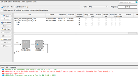 With my old FPGA I was somehow able to program also the `.pof` and I want to do this now on this one. So now I click on "Add file" and select the `.pof` file. This creates the drawing of the second device, which looks the same as with my old FPGA. But now it fails to program.