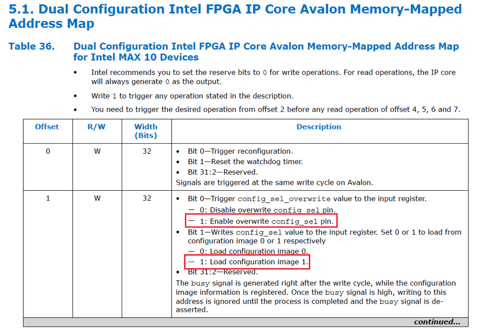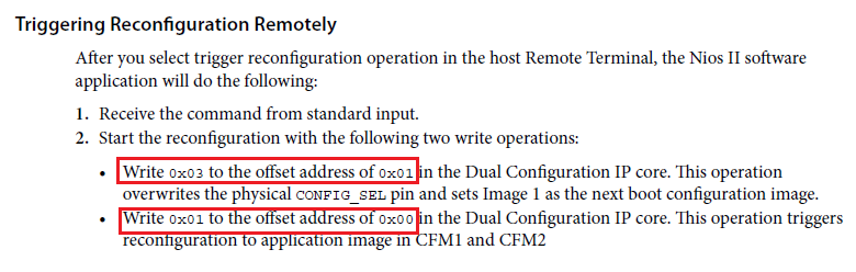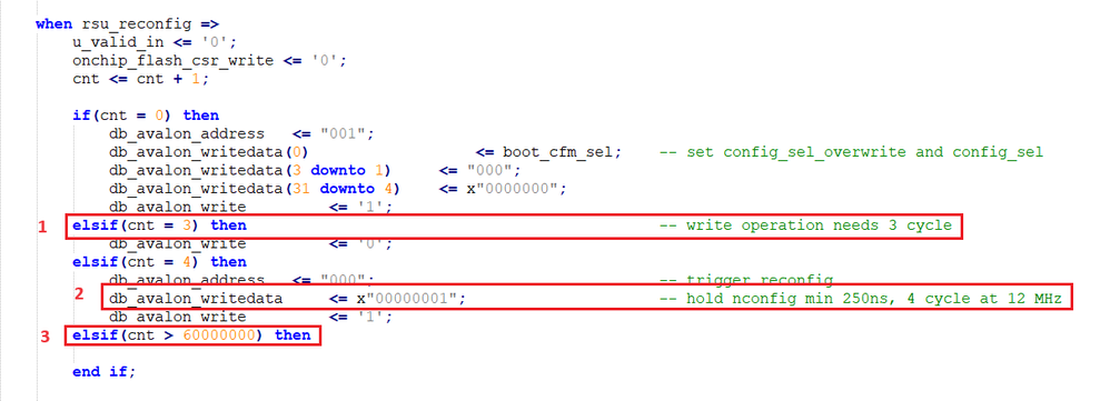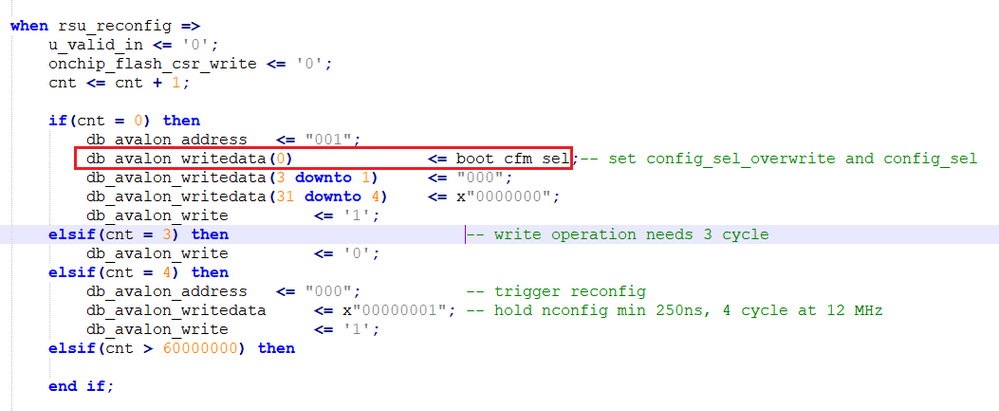 when rsu_reconfig => u_valid_in <= '0'; onchip_flash_csr_write <= '0'; if(cnt = 0) then db_avalon_address <= "001"; db_avalon_writedata(0) <= '1'; -- set config_sel_overwrite db_avalon_writedata(1) <= boot_cfm_sel; -- set config_sel db_avalon_writedata(31 downto 2) <= (others => '0'); -- reserved db_avalon_write <= '1'; db_avalon_read <= '0'; cnt <= cnt + 1; elsif(cnt = 3) then -- write operation needs 3 cycle db_avalon_write <= '0'; db_avalon_read <= '0'; cnt <= cnt + 1; elsif(cnt = 4) then db_avalon_address <= "011"; -- busy reg db_avalon_read <= '1'; db_avalon_write <= '0'; cnt <= cnt + 1; elsif(cnt = 5) then -- read operation needs 1 cycle db_avalon_read <= '0'; db_avalon_write <= '0'; cnt <= cnt + 1; elsif(cnt = 6) then -- read data came in 2th cycle if(db_avalon_readdata /= x"00000000") then -- if ufm/cfm busy cnt <= 4; -- go back until busy flag is over else cnt <= cnt + 1; end if; elsif(cnt = 250000000) then -- high cnt value because of CPU should read the RSU checksum acknowledge db_avalon_address <= "000"; -- trigger reconfig db_avalon_writedata <= x"00000001"; -- hold nconfig min 250ns, 4 cycle at 12 MHz db_avalon_write <= '1'; db_avalon_read <= '0'; cnt <= cnt + 1; else -- wait for FPGA trig reconfig cnt <= cnt + 1; end if; - Ilaria_8 months ago