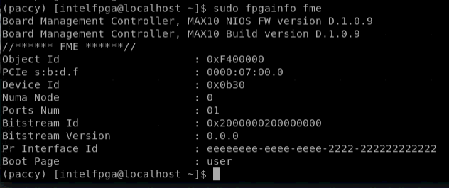 Hi, I am setting up an Arria 10 N3000 PAC, and when I ran `sudo fpgainfo fme`, it shows the output as below. My MAX10 version is way too low, and is the Bitstream version: 0.00 and value for Pr Interface Id expected?