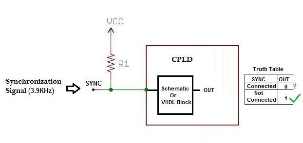 I need help in developing logic to solve my problem. I am developing ultrasonic sensor which operates in single or dual mode. In dual mode it requires synchronization signal. Below image is part of the design where I need to take decision on input SYNC signal. When the SYNC signal is connected to CPLD, it gives 3.9 KHz as input and when SYNC signal is disconnected the same pin is pulled high to Vcc (i. e. logic 1). So I need a logic (schematic or VHDL code) which will give me output as per the truth table given below. I tried different logic circuit using gates and FF but not succeed. I tried the VHDL coding also, but its giving error. Please help.