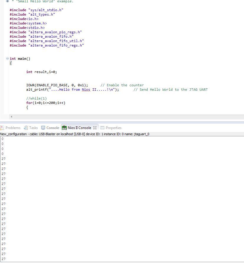 I would like to have some advice to write the c code in NIOS. The counter must sends bits continuously to FIFO but the counter must stops when the FIFO is almost full. When the FIFO returns almost_empty the counter must restarts.