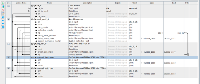 My QSYS project looks like below - if you want me to attach a QAR of my project I can do that as well.