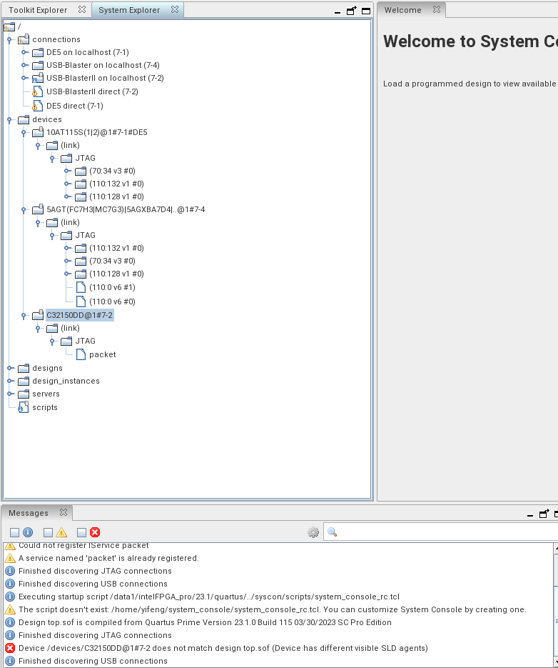 In the design, I have included a "JTAG to Avalon Master Bridge" in the qsys, which is not accessible neither, in Fig3. As a reference, the other devices (Arria5 and Arria 10) connected to this PC can be recognized with their JTAG nodes, but this Stratix 10 (with JTAGID=C32150DD) doesn't show up any JTAG service, to cross-check which is not discoverable through tcl: `set masters [get_service_paths master]`. When I tried to link the device to my top.sof, it prompts error as "Device has different visible SLD agents".