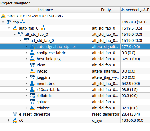 I have encountered a problem that any services related to JTAG of this Stratix 10 FPGA cannot be accessed. For example, when compiled with Signaltap, see Fig.1 and Fig.2, it shows "Instance not found", even if in the Project Navigator, the SignalTap is synthesized in auto_fab and the correct sof file was programmed.
