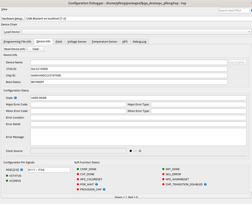 The Stratix 10 FPGA is correctly programmed and showed correct Device Name under Programmer, in Fig.4. It can be confirmed by Configuration Debugger, in Fig.5 and 6, which also describes part of my settings.