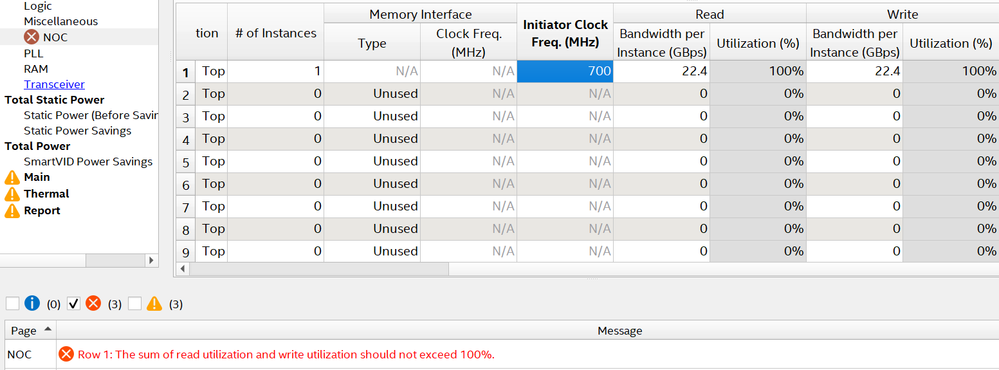 I was using the Power Thermal Calculator (PTC) to check NoC power and I entered the required read and write bandwidth for an initiator as 22.4GBps and 22.4GBps. It threw out an error saying the bandwidth (read+write) utilization percentage should not exceed 100%. It was 200% in this case.