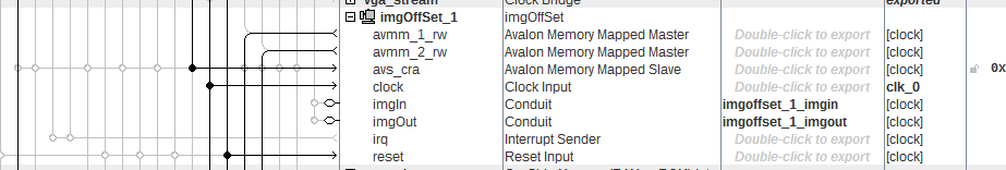 }The problem is that the HLS creates two conduits that is the base address of ImgIn and ImgOut, I would like to have this address on the already existent CSR register, that is accessible by the Slave port created by the compiler, as shown bellow:
