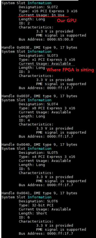 The FPGA devkit is sitting on the PCIe slot 3, but it was not there when we searched PCIe devices by "lspci" command. It should be shown as "In use", not "Available." (since it means the slot is empty.)
