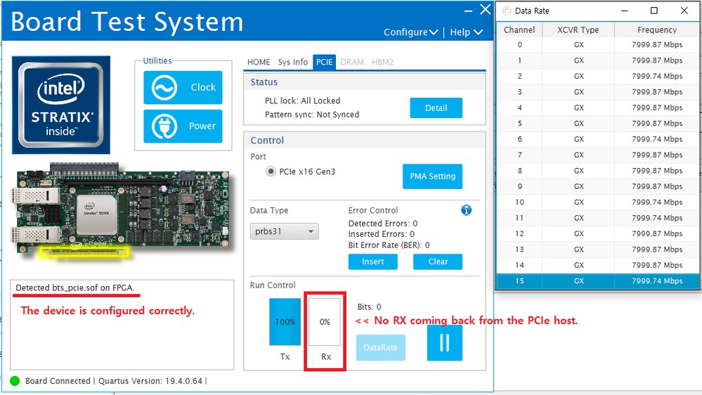 Also, we tested a golden design file that comes with the devkit. The design itself is working and we can verify it through the Board Test System(BTS) utility on windows. However, we can't still discover the board in the PCIe device list even with this golden design.