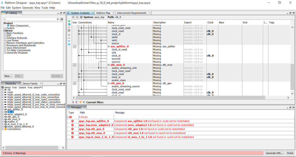 Error: qsys_top.eth_gen_0: Component eth_gen 1.0 not found or could not be instantiated