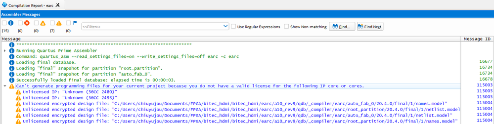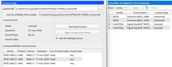 Quartus Assembler License Error: Unlicensed IP 56CC 2480 & 2493 in Bitec HDMI 2.1 eARC Demo