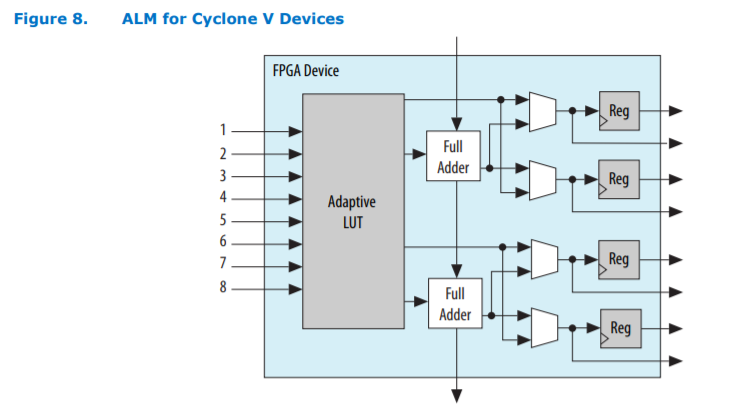 Cyclone V devices use a 28 nm ALM as the basic building block of the logic fabric. The ALM has an 8-input fracturable look-up table (LUT) with four dedicated registers.