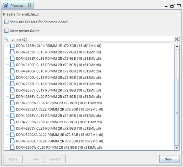3- Also, we need a DDR4 RDIMM module which its settings and parameters are already available in the preset libraries of the "External Memory Interfaces (EMIF) IP". As you know, when we open the EMIF IP core in the Platform Designer, the preset libraries are available in the right pane of the window.