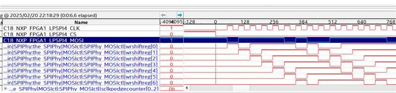 While we can correctly observe the MOSI, CLK, and CS signals, we noticed that signal propagation appears to be causing issues. Specifically, the first bit in the wrshiftreg samples as 1 instead of 0. Despite multiple attempts to troubleshoot, the signals seem to be getting corrupted at some point (this example is only one issue we've encountered).