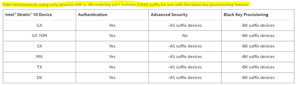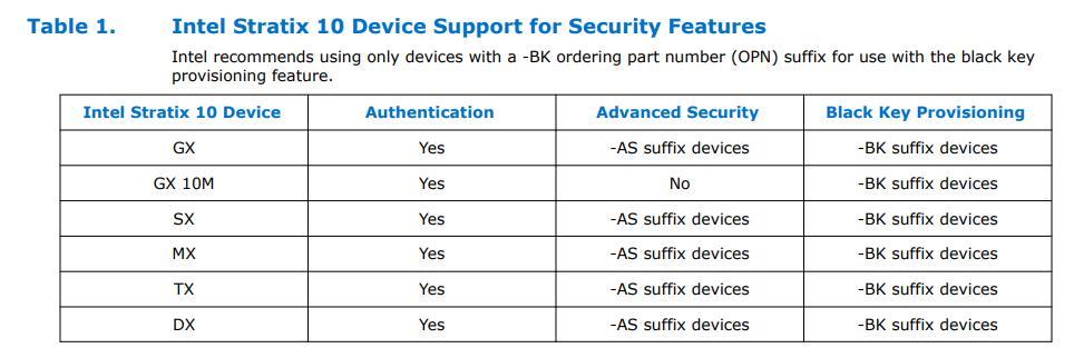 Does the Stratix 10 BK option include the advanced security features, or do you have to choose one over the other?