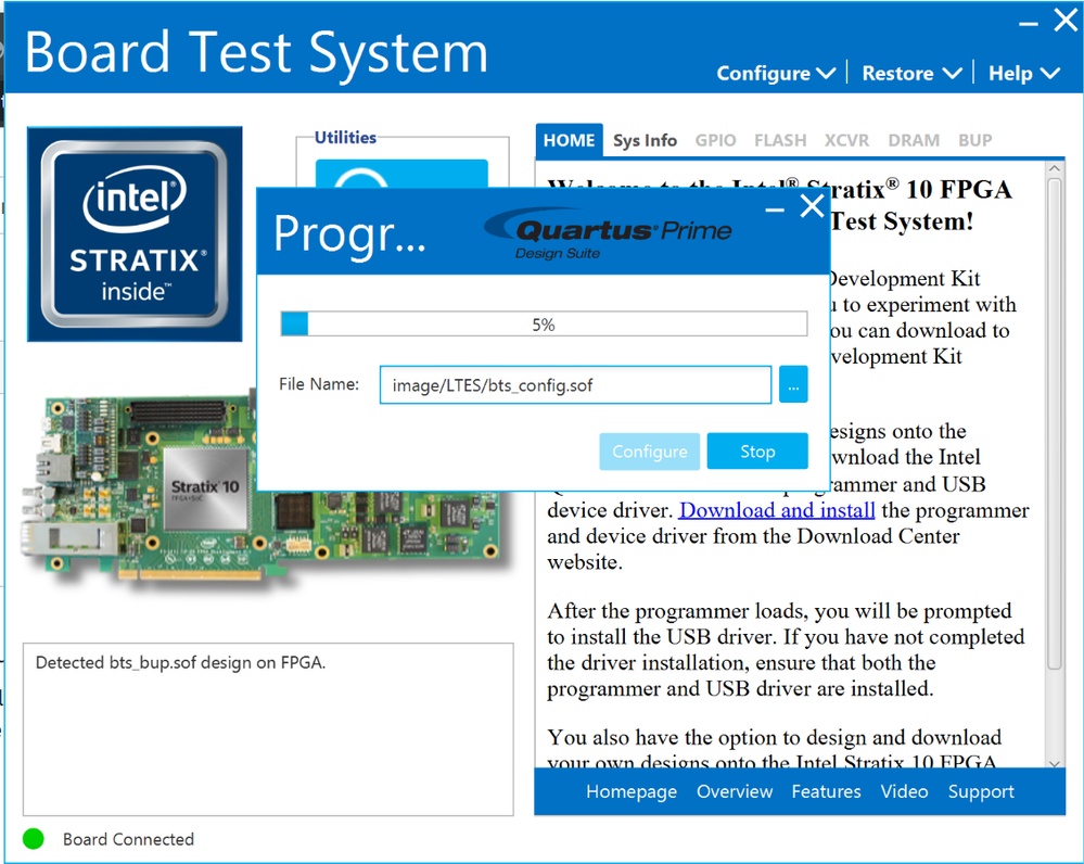 Failed to read production information from this SOF in the FPGA. Please select compatible FPGA design from Configure option in the menu bar. If you still meet this issue, please try to restart the BTS GUI.