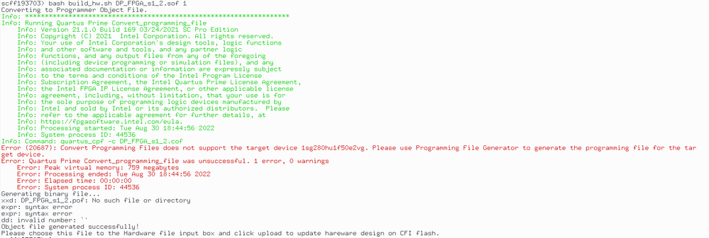 Also, I did want to mention that I did manage to create the binary file through other means... but it caused the board to stop operating entirely. I needed to do this because this Stratix 10 FPGA is unable to produce .pof files through quartus natively. Essentially we needed to factory restore the board after all of this though.