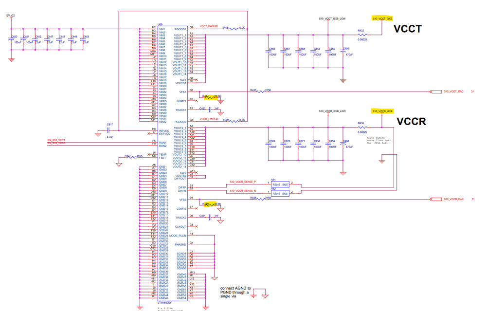 Any update on this issue? I believe the issue is LTM2987CY undervoltage level threshold is set above 1.2V for U70 supply I believe. We need to figure out how to program that chip to fix that. if we remove R446 and put a 10k for R443 (manually enabling U70), we will get the 1.2V output but EN_S10_VCCIO_FMCA will remain low and that is what enables the "12V" signal. This "12V" is used for the fan, J28 connector, and on the FMC connector so we will need this 12V, therefore we need EN_S10_VCCIO_FMCA to go high and be able to turn U70 on.