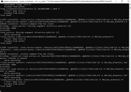 claim_service master {/devices/5AGT(FD3H3|MD3G3)|5AGXBB3D4|..@1#USB-1/(link)/JTAG/(110:132 v1 #0)/phy_0/master} m CLIENT (sock2256): claim_service master {/devices/5AGT(FD3H3|MD3G3)|5AGXBB3D4|..@1#USB-1/(link)/JTAG/(110:132 v1 #0)/phy_0/master} m SERVER (sock2256): Invalid command from the client ErrorMsg : Could not claim service at /devices/5AGT(FD3H3|MD3G3)|5AGXBB3D4|..@1#USB-1/(link)/JTAG/(110:132 v1 #0)/phy_0/master: Channel is opened