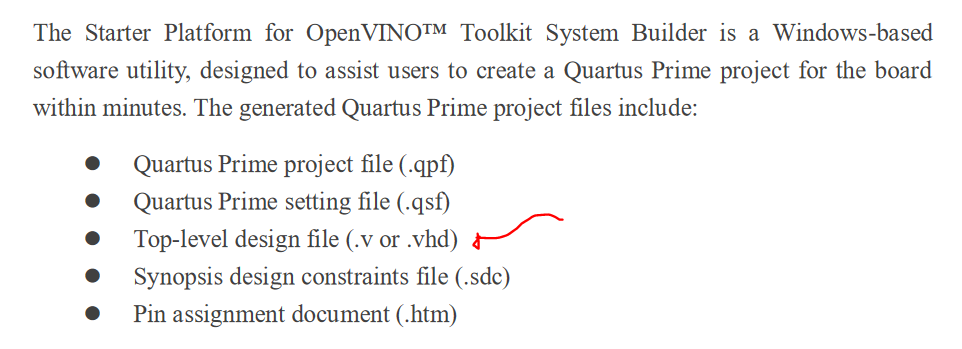 In the manual for the openVINO it says you can choose either .v or .vhd files. But in the actual software I can't find any option for this. Has anyone managed to generate .vhd top level entity with the Terasic System Builder or have any tips for converting the .v file to .vhd.