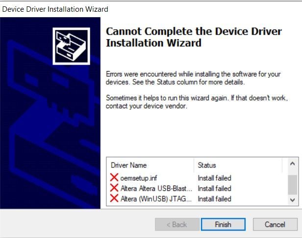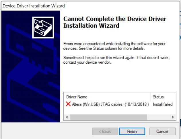But I have a problem with the JTAG drivers: after the Quartus installation is complete, the Device Driver Installation Wizard fails: