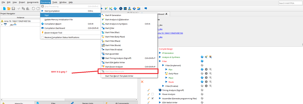 In Quartus Pro menu list, I found that "rapid compile" is grey, so I just wonder How can I enable "rapid compimling" to quicken the project compiling, to ease the debugging. Is there any method to enable "the incremental compiling" in my Arria10 Project ? Thanks