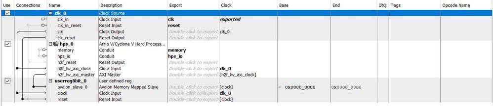 where I just wana write and read data to a simple 8 bit register which I wrote and instantiated in qsys as usererg8bit. Here is the verilog HDL code for that