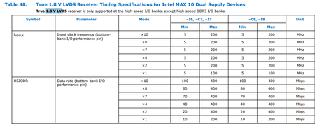 Hi all! I need to receive data from ADC to MAX10 device in my project. The issue is that data rate is 500 Mbps and input clock frequency is 250 MHz. I checked Intel® MAX® 10 FPGA Device Datasheet ...