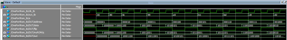 - Top file 'OnePortRom.v' - Test Bench 'OnePortRom_tb.v' - Rom model verilog 'RomMem.v' and 'RomMem_bb.v' - Rom model VHDL model 'RomMemVhdl.vhd' - MIF file 'RomInit.mif'