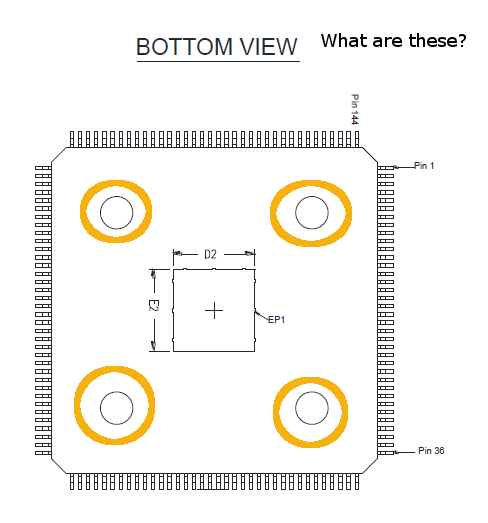 I assume these circles are for a device marking purpose only. According to device samples of 10M08SAE and 10M02SCE in EQFP144 package there are country code and other code stored inside of the two circles. These circles are not connected to any wire or die/chip because of the device plastic package. Hope it helps, best regards, Martin