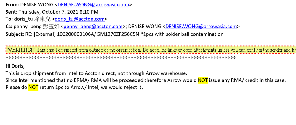 We could guarantee devices leave factory door in good condition. Once shipment leaves factory, we are no longer liable as it subjects to forwarder’s handling, distributor’s handling and customer’s handling. There is no way to tell if the damages are done before devices leave factory door. Therefore, no ERMA/RMA will be proceeded due to the solder ball contamination.