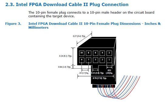 Well, I have measured all the 2x5 100mil headers I have on all my different FPGA programming boards and the inside dimension of the boxed header comes out to be 700mil X 250mil. So the 'standard' 2x5 female header fits perfectly. I have third party USB Blaster clones, a TerASIC USB Blaster, and an original ByteBlasterII (ie, LPT port to 10pin header). All are exactly the same female 2x5 connector.