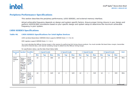 Hello, I am looking to find the fabric speed of Agilex FPGA. OPN: AGFA012R24C2E1V Can you help to answer the following questions? 1) Is LVDS serdes a part of FPGA Fabric? 2) How do I fin...