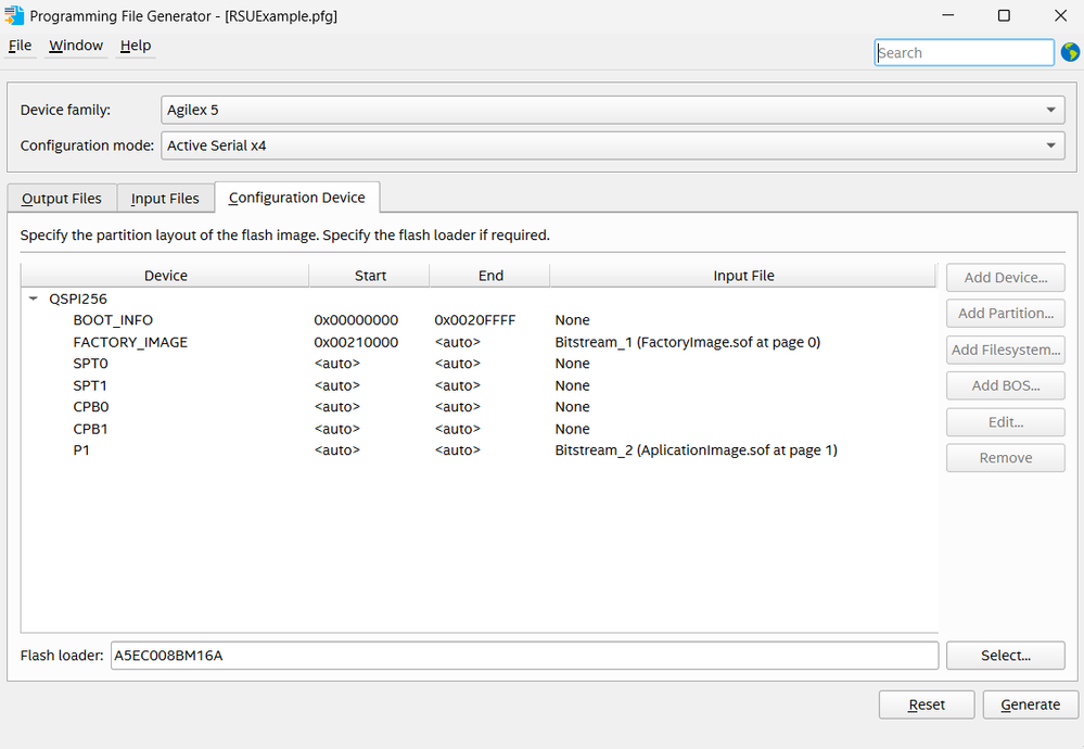 We re using am AXE5000 board with an Agilex5 A5EC008BM16AE6S (M16A) model and a 256 Mbit QSPI config Flash memory. We are working with Quartus Prime Pro 25.1.0 version.