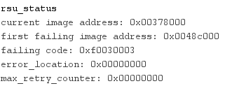 Now, if we restart the system we see how the application image loaded is the one which was originally set on address 0x00378000. Running "rsu_status", we see how the added image failed