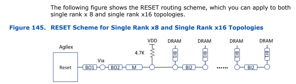 1. The Agliex 7 F Series EMIF User Guide page 191 Figure 145 of section 6.5.6.3 shows RESET line to DRAM pulled up to VDD with 4.7k ohm resistor and this was implemented on Agilex 7 F series evaluation board