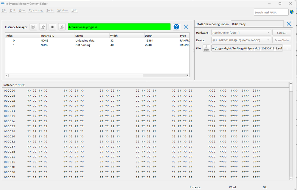 I'm able to program the device through the "In-System Memory Content Editor". The Instance Manager shows two instances of type RAM/ROM that are Read/Write. When I right click and go to "Read Data from In-System Memory" the status says "Acquisition in progress". It stays in this state for some minutes until it times out.