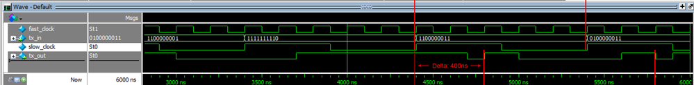 The 10-to-1 serializer is driven with two external clocks. I am feeding the input on the rising edge of the slow clock and 400ns later (in ModelSim at least) I get the serialized output out of Altera's Soft LVDS block. Each individual output state is aligned with the fast clock, but I do not see any output clock that I can use to tell the receiver when a new block of data begins. Where do I get a slow clock signal that's aligned with the SERDES output start?