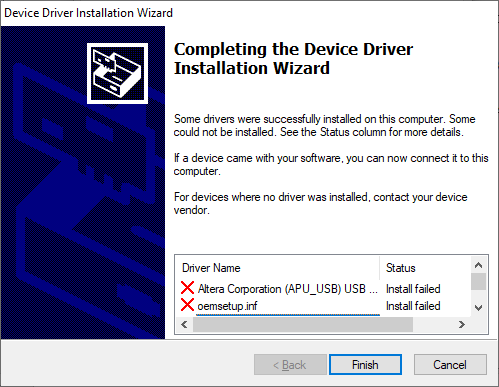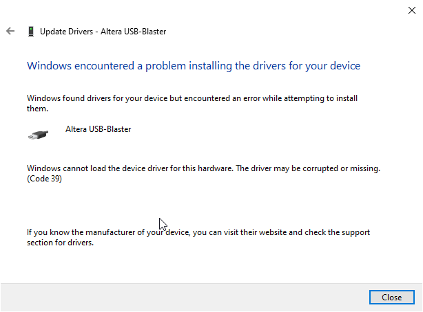 USB Blaster is not recognized correctly in the device manager and it showing warning symbol. and device is not started with below error massage