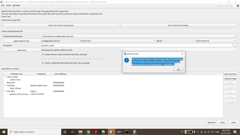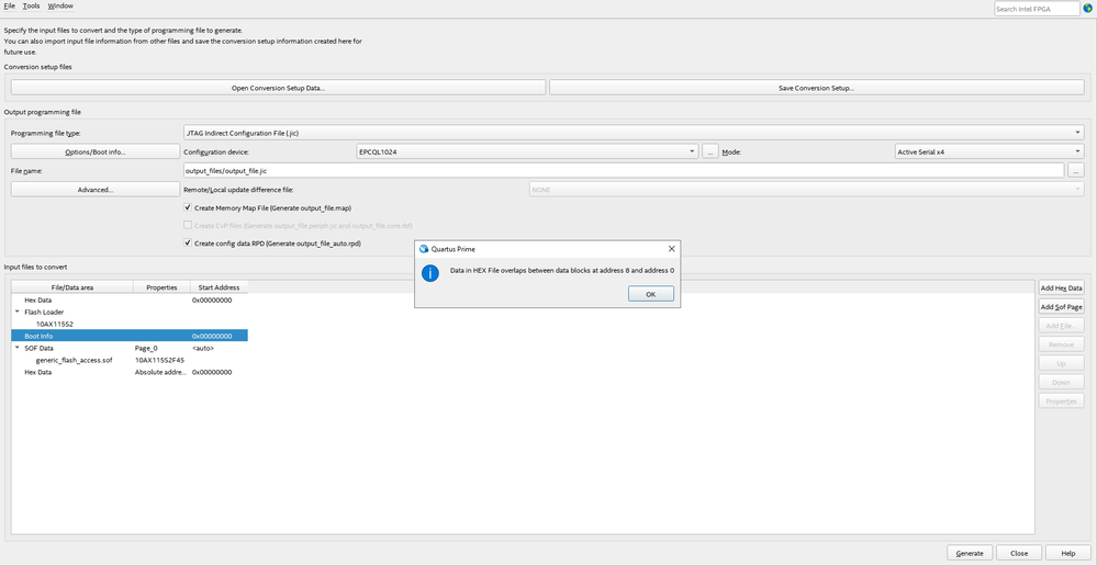1.Here the issue is how to generate .hex file (if i generate .hex file with the nios tool, while generating .jic file Quartus tool is telling like address overlap with 0x0000_00F0).
